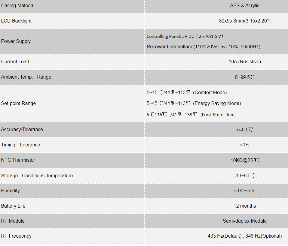n RF Frequency optional: 433 Hz(Default) , 846 Hz(optional)