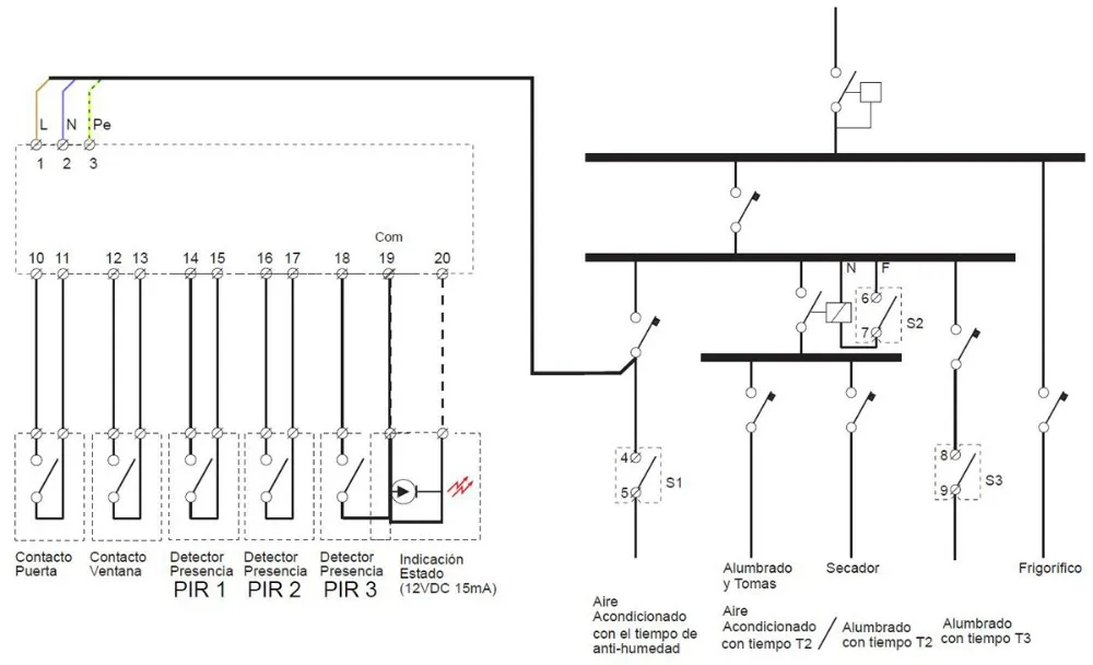 If during this time, any of the PIR presence detectors indicates movement, the system will assume that there is presence in the room, then it will operate as an "Occupied" mode maintaining activate S1, S2 and S3 circuit. If no movement is system initiates the programmed delay time and disconnect the various outputs.