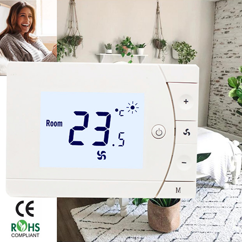 The digital thermostat is designed to controls the fans, valves, dampers or electric heater in fan coil units and heating applications in industrial, commercial or residential environment.