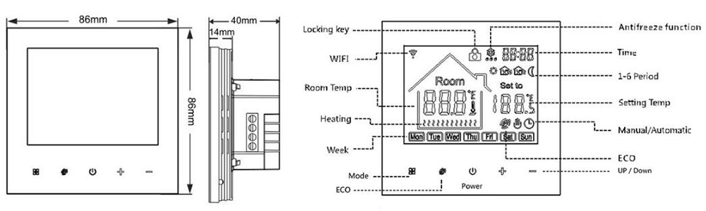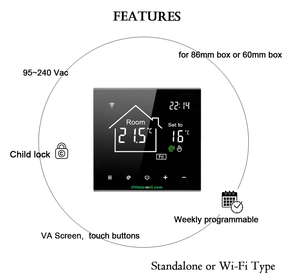El termostato de la serie HTW-HT09B se utiliza ampliamente en entornos como hogares, edificios residenciales, escuelas, hoteles, hospitales, oficinas, etc. para mantener una temperatura ambiente ideal. Puede utilizarse en sistemas de calefacción por caldera de agua/gas, calefacción por suelo radiante eléctrico o calefacción por agua.