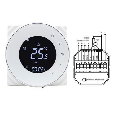 HTW-T6861, este termostato digital está diseñado para la aplicación de un ventilador de 3 velocidades y válvulas en un sistema fan coil.