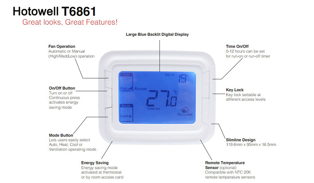 HTW-T6861, este termostato digital está diseñado para la aplicación de un ventilador de 3 velocidades y válvulas en un sistema de fan coil. Hay 8 submodelos de acuerdo con el voltaje y la dirección diferentes, que podrían satisfacer diferentes requisitos en consecuencia.