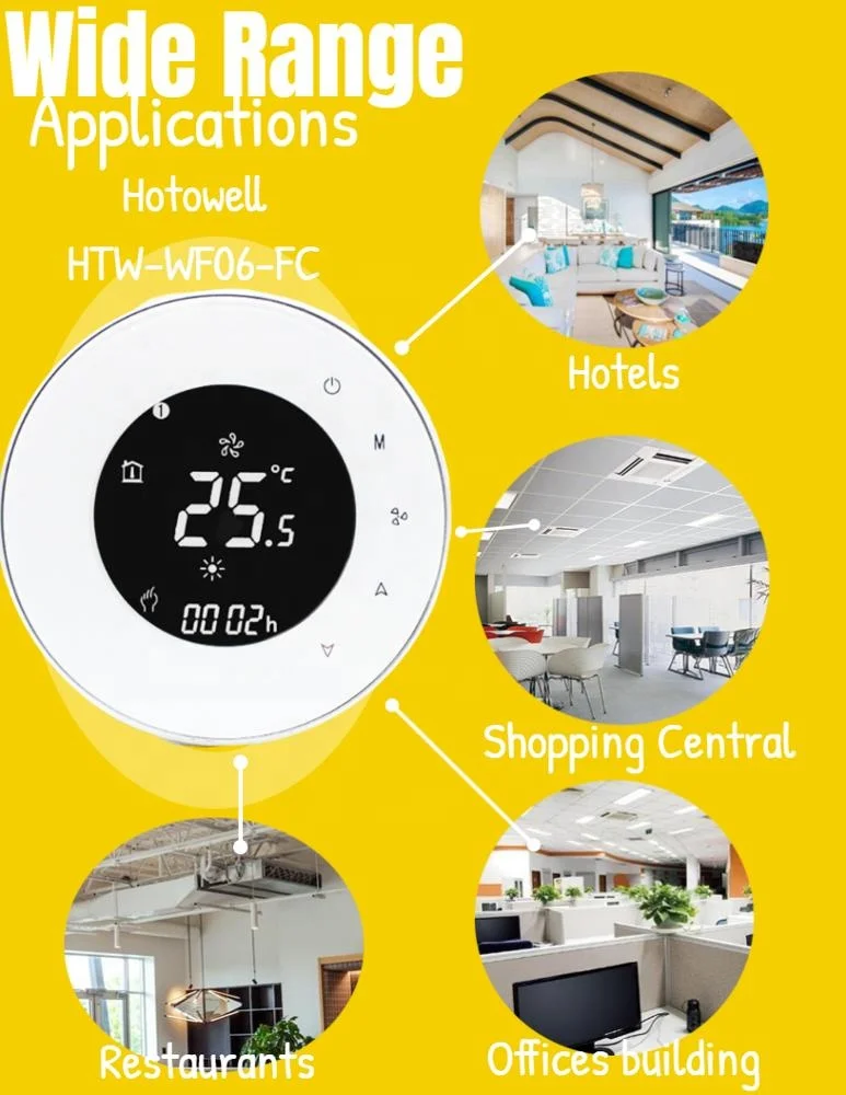HTW-WF06-FC serie Smart Wifi termostato fan coil es ampliamente utilizado en estos entornos como hogares, edificios residenciales, escuelas, hoteles, hospitales, oficinas y etc. para principal un propósito ideal temperatura ambiente.