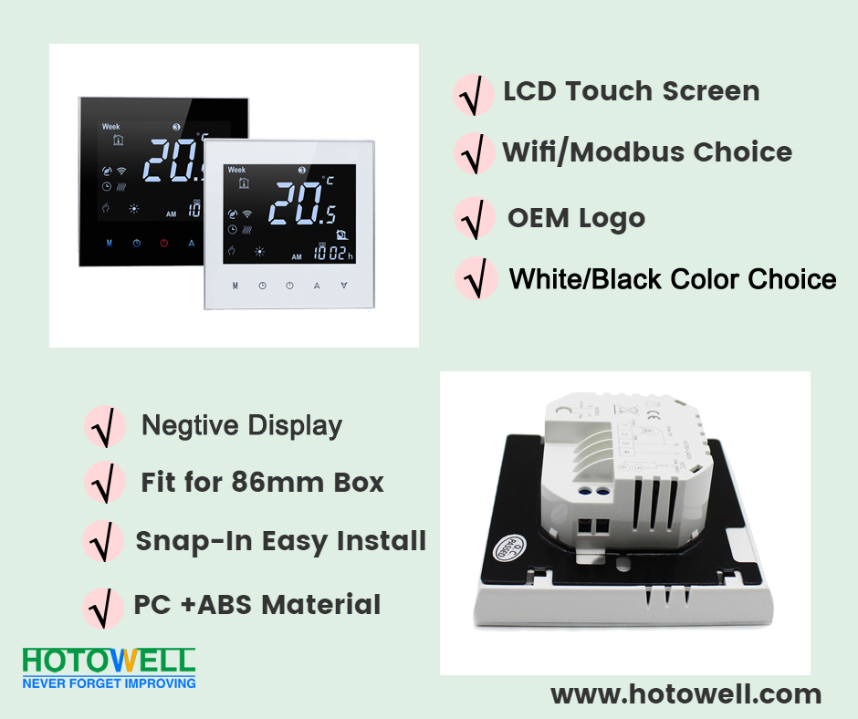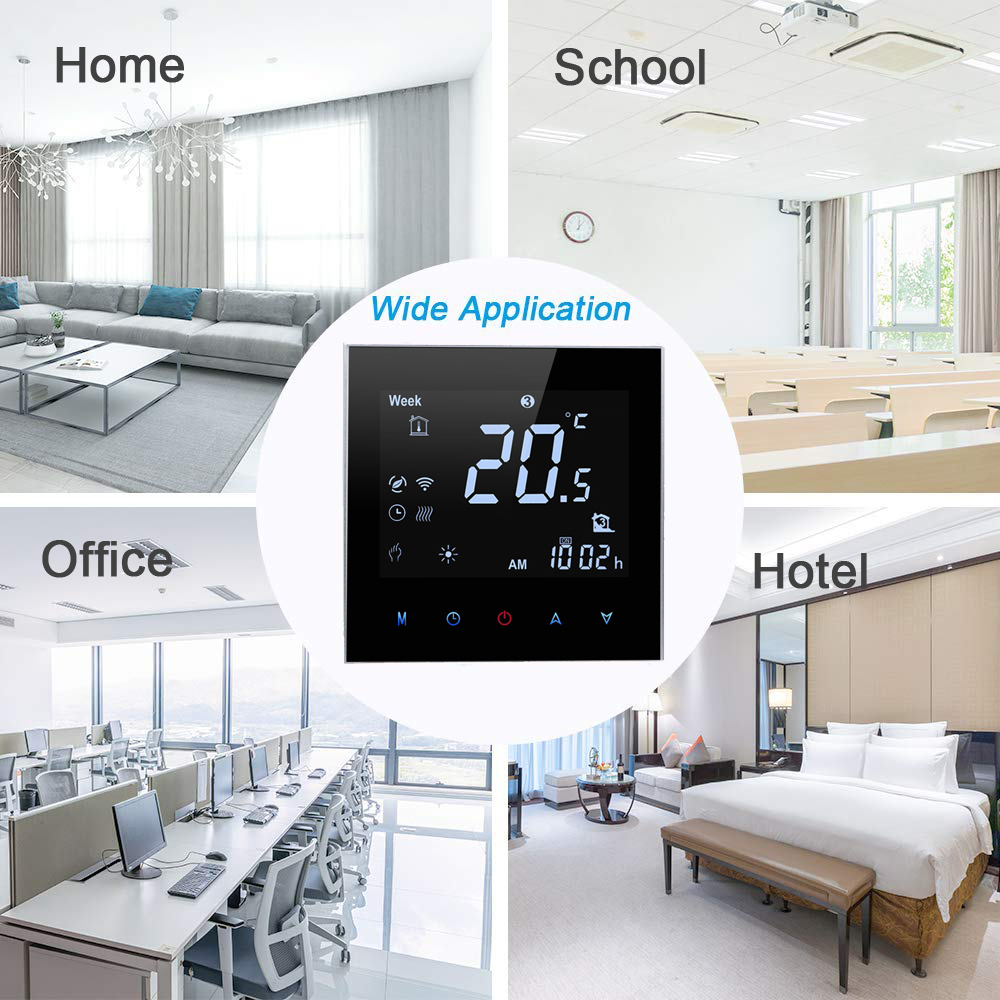 El termostato Wifi de la serie HTW-WF02 se usa ampliamente en estos entornos como hogares, edificios residenciales, escuelas, hoteles, hospitales, oficinas, etc. para lograr un propósito ideal de temperatura ambiente. Se puede utilizar en sistemas de calefacción eléctrica por suelo radiante, calefacción de agua o calderas de agua / gas.