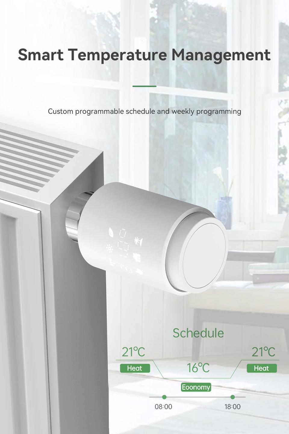 El dispositivo mueve una válvula para controlar inteligentemente el flujo de calor al radiador. Con él, puede ajustar cómodamente la temperatura ambiente entre 5 y 30 °C y ahorrar más del 15 % de energía.