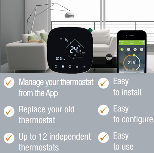 El termostato Wifi de la serie HTW-ECB6 se usa ampliamente en estos entornos como hogares, edificios residenciales, escuelas, hoteles, hospitales, oficinas, etc. para lograr un propósito ideal de temperatura ambiente. Se puede utilizar en sistemas de calefacción eléctrica por suelo radiante, calefacción de agua o calderas de agua / gas.