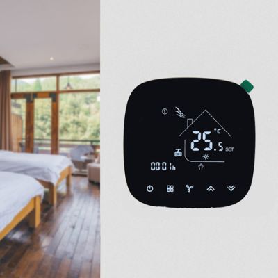 Termostato fancoil Smart Wifi serie HTW-WF01-FC. Se usa ampliamente en entornos como hogares, edificios residenciales, escuelas, hoteles, hospitales, oficinas, etc. para lograr una temperatura ambiente ideal.