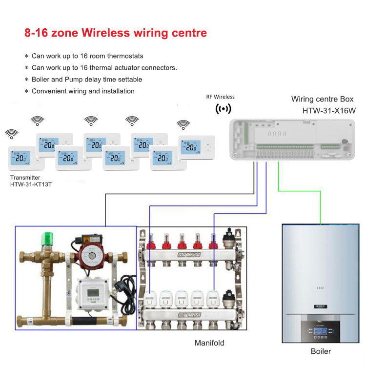 El centro de cableado HTW-31-X16W puede controlar hasta 16 zonas simultáneamente con termostatos. Se utiliza para controlar cualquier actuador o válvula que requiera una señal de 230v AC. Al mismo tiempo ofrece la posibilidad de operar una caldera a través de una salida libre de tensión.