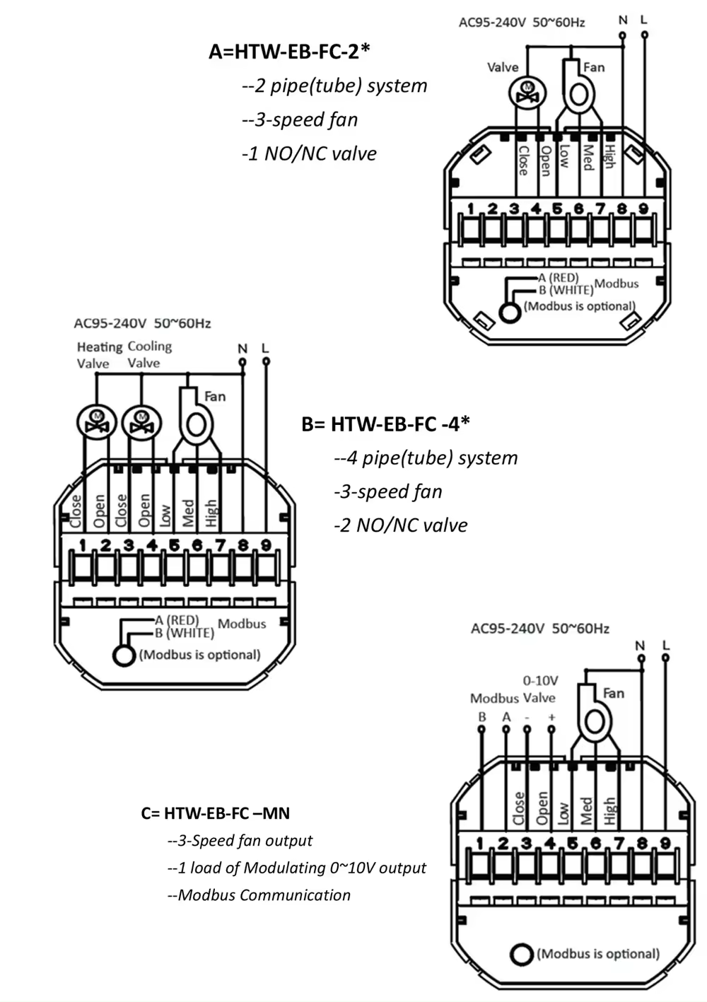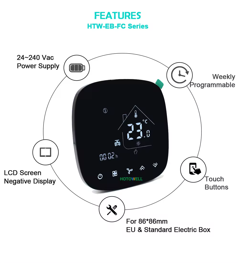 HTW-EB-FC serie inteligente Wifi termostato fan coil es ampliamente utilizado en estos entornos como hogares, edificios residenciales, escuelas, hoteles, hospitales, oficinas y etc. para principal un propósito ideal temperatura ambiente.