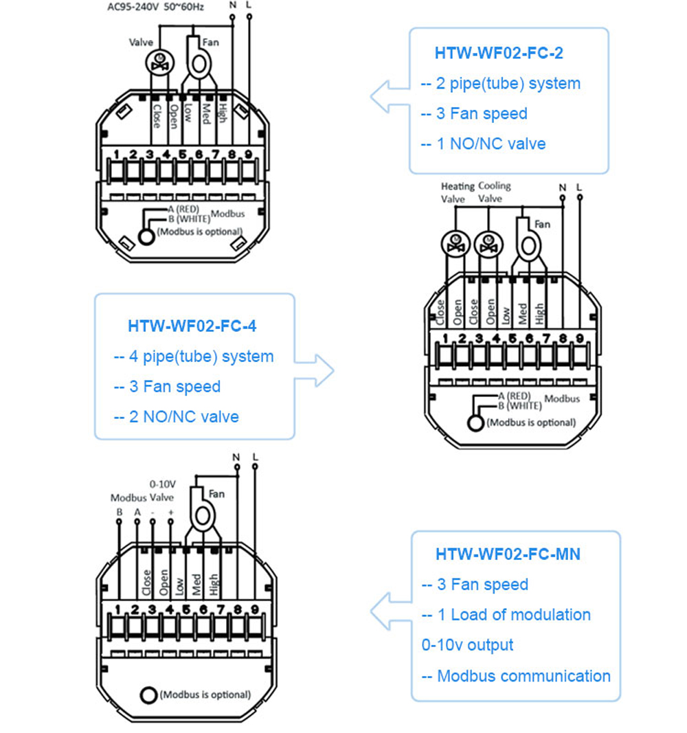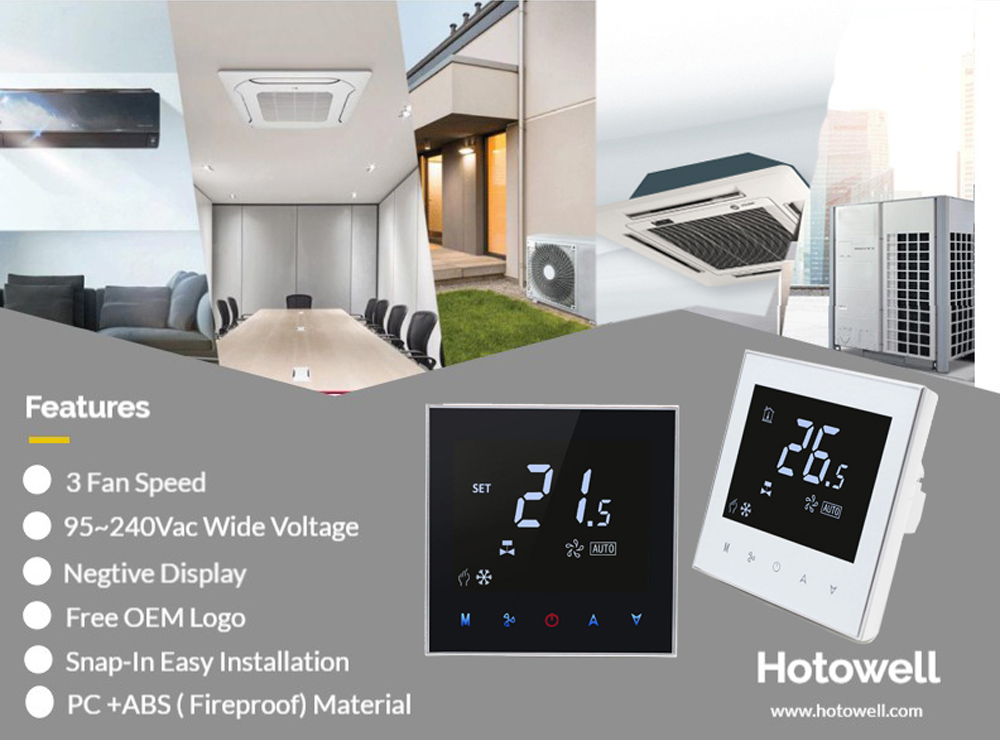 HTW-WF02-FC serie inteligente Wifi termostato fan coil es ampliamente utilizado en estos entornos como hogares, edificios residenciales, escuelas, hoteles, hospitales, oficinas y etc. para principal un propósito ideal temperatura ambiente.