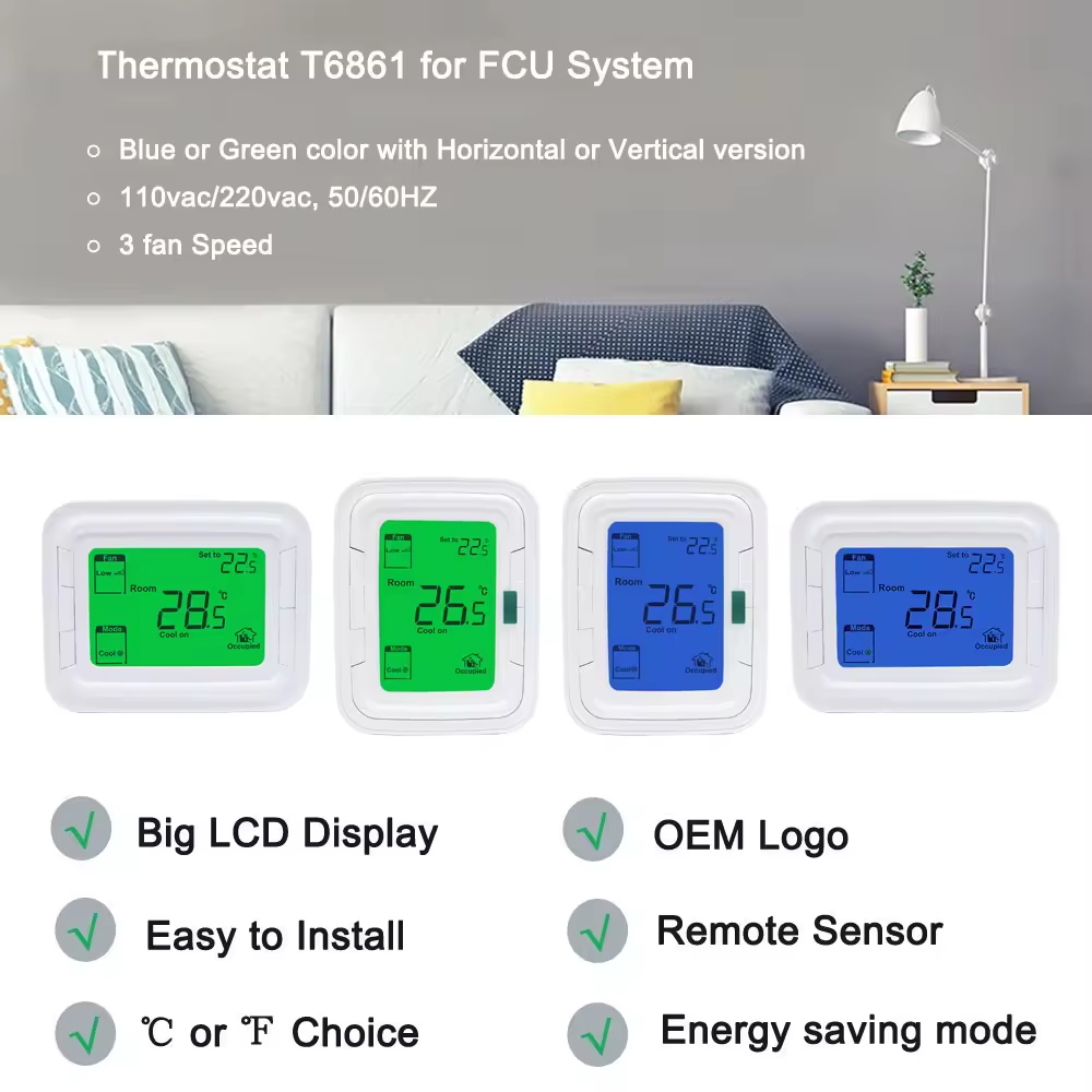 Los termostatos digitales T6861 están diseñados para la aplicación de ventiladores y válvulas de 3 velocidades en un sistema fan coil. Incluye: 2 tubos solo frío/solo calor/cambio manual y 4 tubos cambio manual o automático. La velocidad del ventilador se puede seleccionar en modo de control automático o manual de 3 velocidades. En el modo de ventilación, el ventilador solo admite control de velocidad manual.