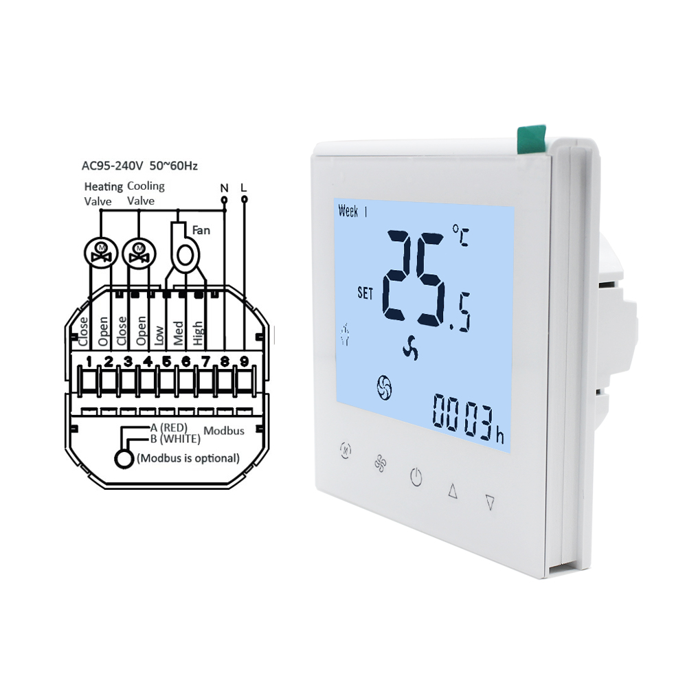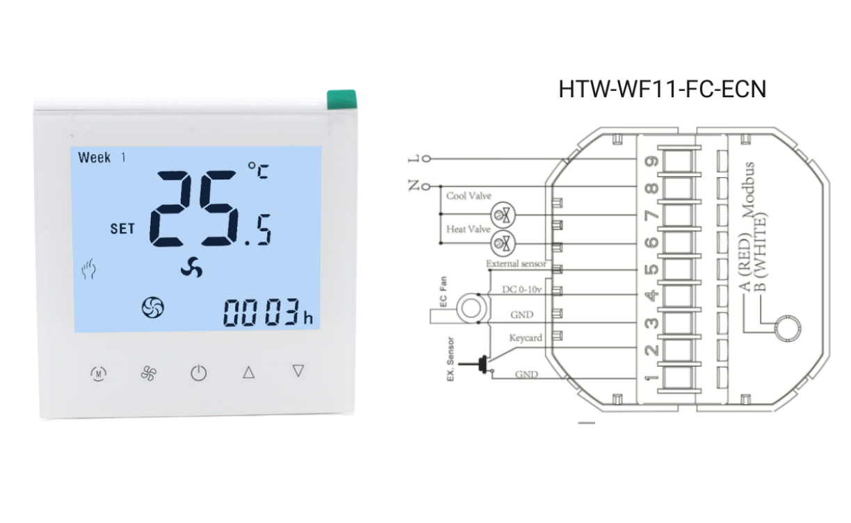 HTW-WF11-FC-ECN series Modbus fan coil thermostat is designed with EC Fan + 1 cool valve + 1 heat valve + external sensor + keycard + modbus communication functions, it is widely used in these environment like Homes, Residential buildings, School, Hotels, Hospitals, Offices and etc. To main an ideal room temperature purpose.