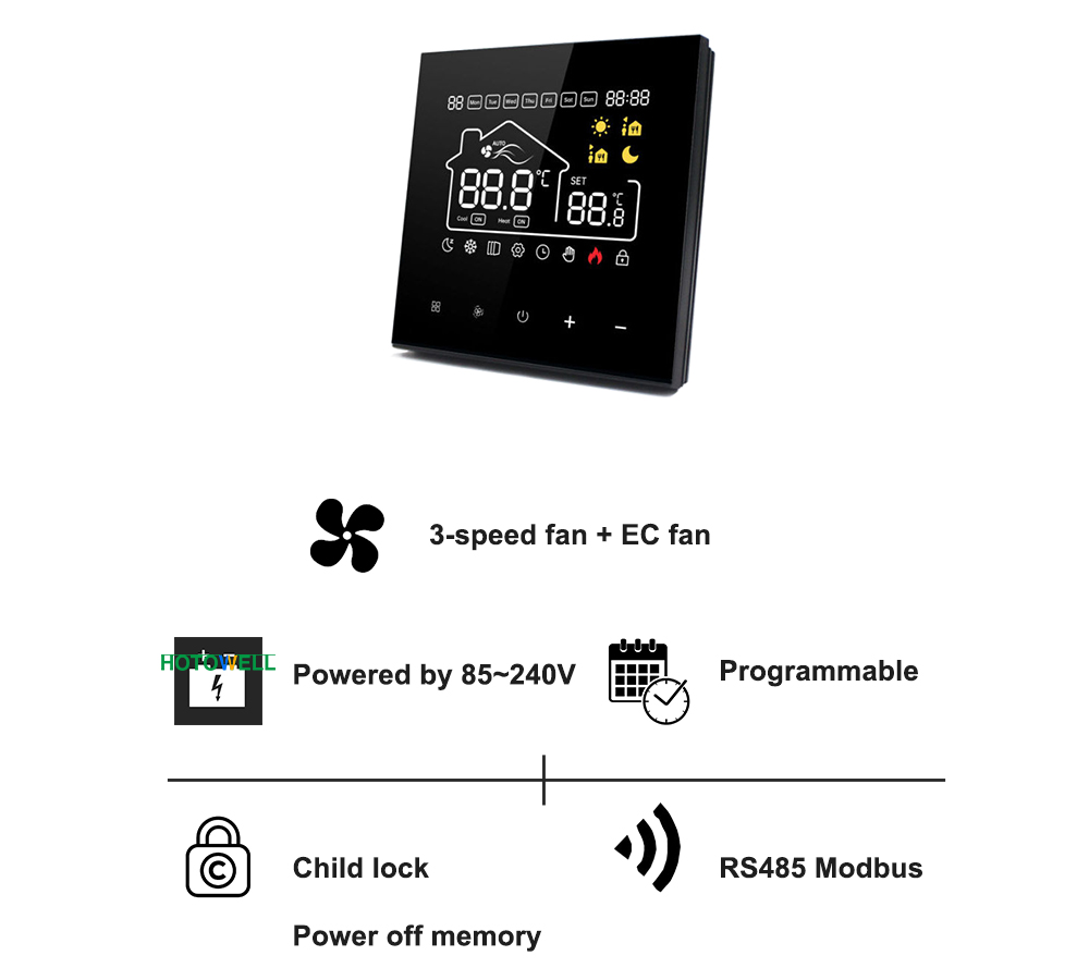 This model is widely used in hotel projects because its keycard and Modbus functions can help save energy. With the keycard feature, the thermostat works normally only when a keycard is in place; otherwise, it will be in energy-saving/standby mode.