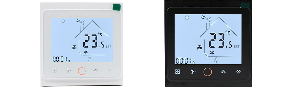 Featuring an LCD screen and touch buttons, the thermostat looks elegant and perfect fit for a wide range of room designs. Colour options are white and black, and more colours can be customised.
