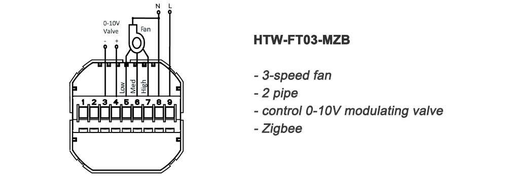HTW-FT03-MZB is specifically designed for fan coil systems, making it ideal for a wide range of residential and commercial applications. It controls 3-speed fans and 2-pipe 0-10V modulating valves to ensure a comfortable temperature.