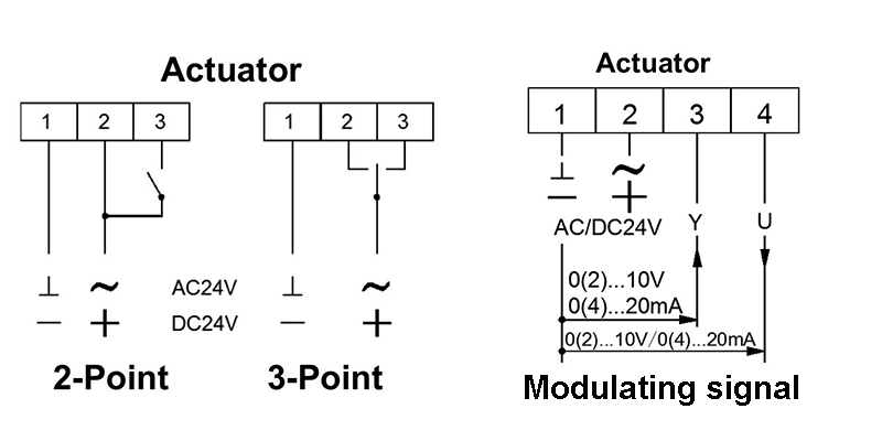 Our actuators combine the first 2 wiring in one model, so there are actually 2 types that need to be noted: [on-off/2-position/3-point] and [modulating].