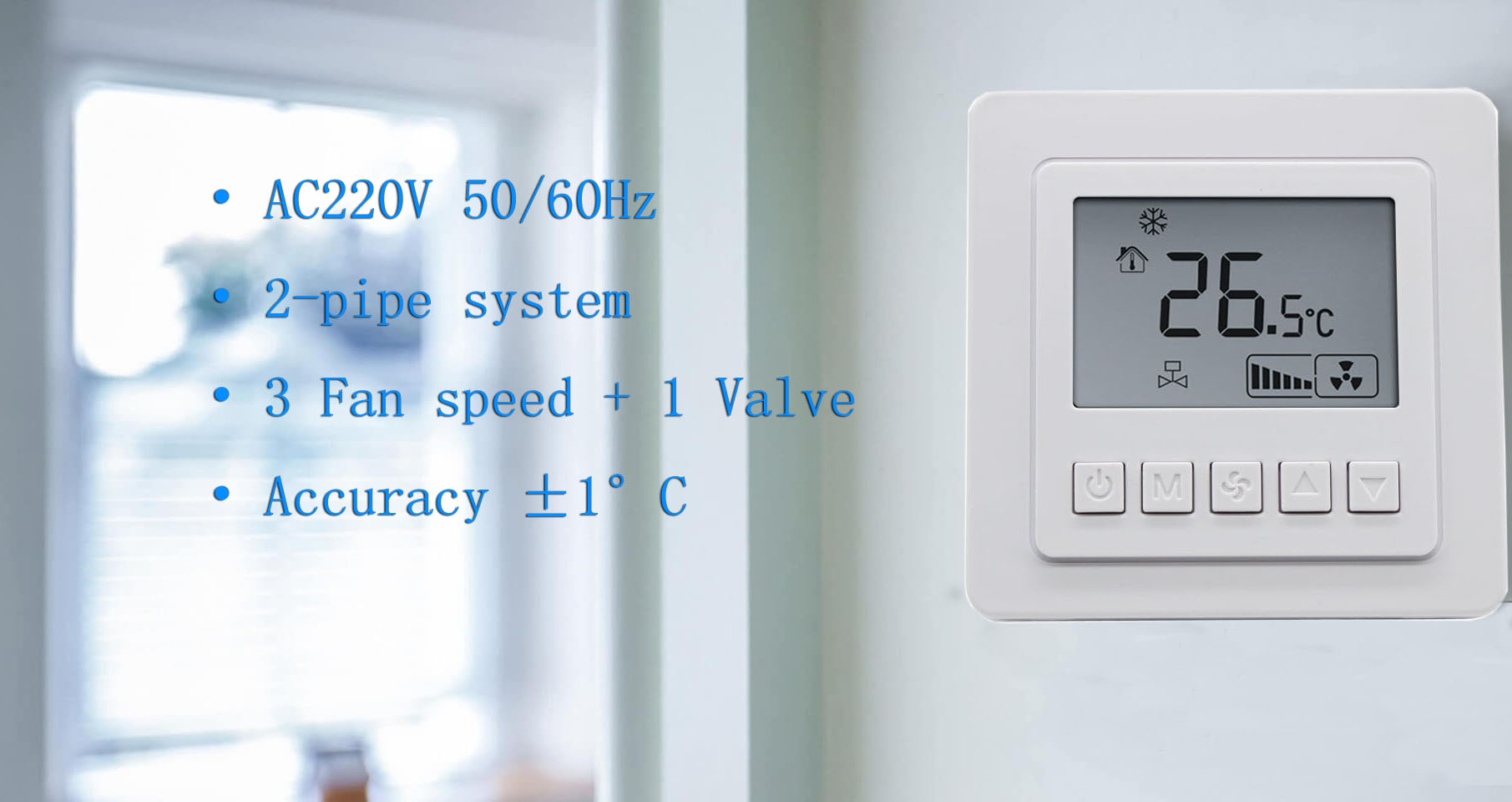 HTW-61-FC003/T5000 LCD Digital Fan Coil Thermostats are designed to control heating, cooling, or year round air conditioning unit in Commercial, Industrial and Residential Installation. Typical Application includes the control of fan coil units, packaged terminal air conditioners and combination heating and cooling equipment. As part of the system that consists of a two-way or three-way valve and a multi-speed line voltage fan.