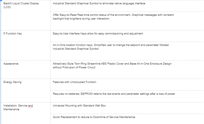 These aesthetic design thermostat features with Backlit Liquid Crystal Display (LCD); an attractive white color in a compact size complements any decor. The thermostat does not require any battery backup as setpoint and other parameters are stored in non- volatile memory. The intuitive operation makes the thermostat very user-friendly.