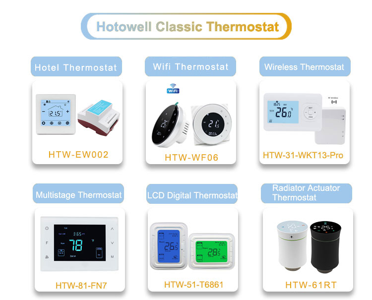 HTW-ECB6 thermostat is widely use for heating system. Include three models, 3A for water heating, 16A for electric heating and NV for gas boiler heating. Which with options of Wifi and Modbus functions.