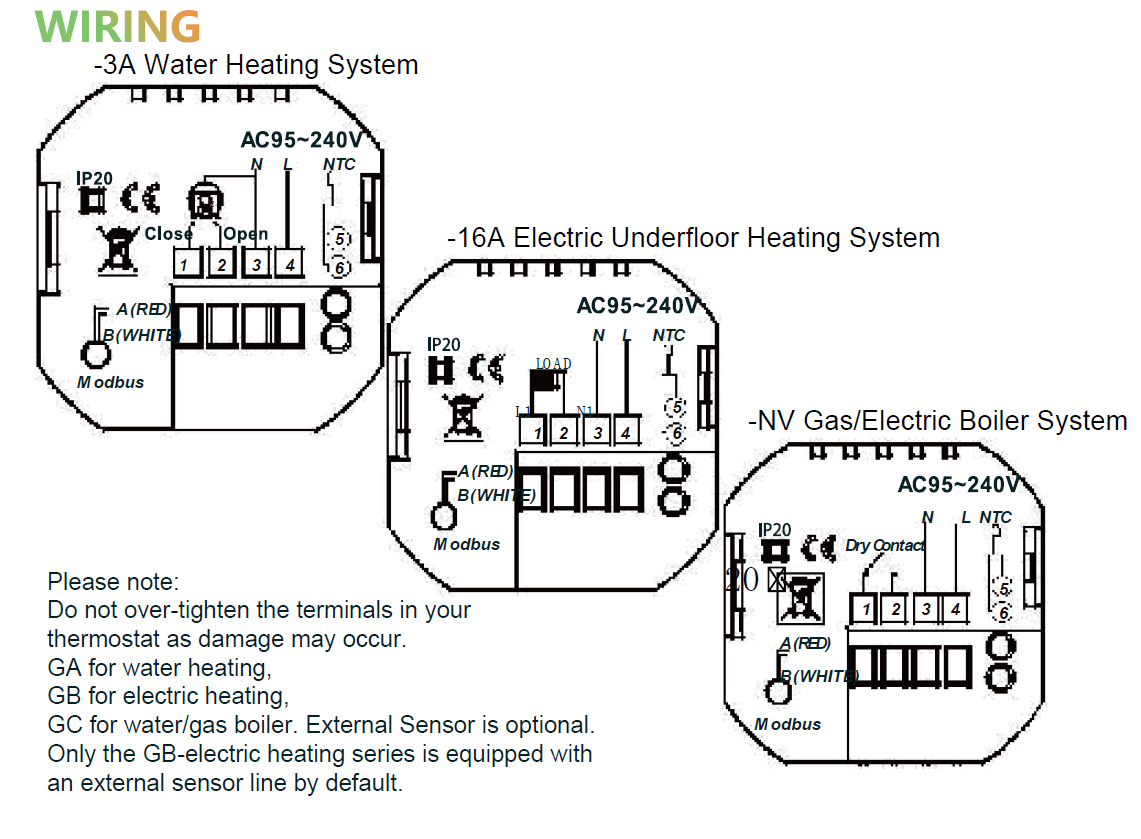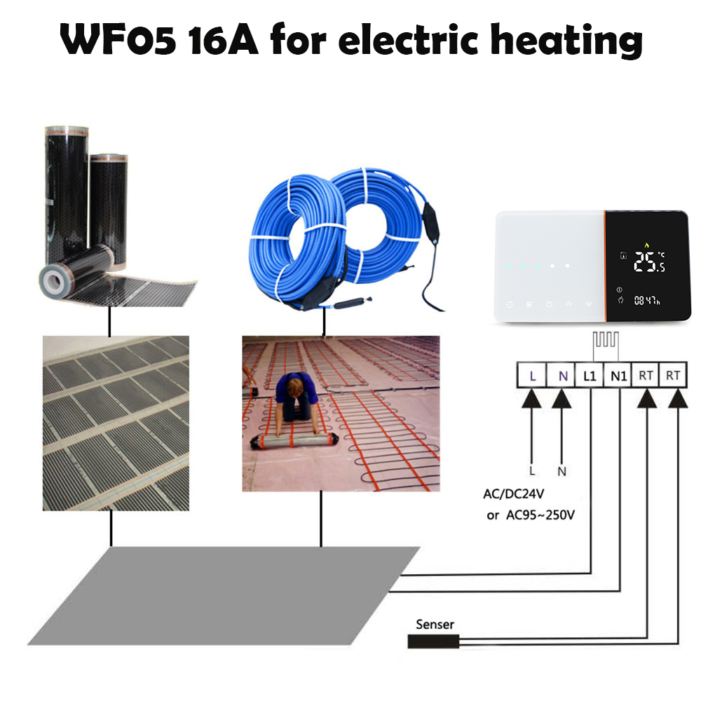HTW-WF05 is suitable for electric heating, water heating, wall-hung boilers and boiler-temperature control systems.It can be used in smart controlling houses, shopping malls, and industrial places. Before use, please confirm the specific model of this product and the corresponding heating equipment.Please read the wiring diagram to identify the model or contact the merchant.