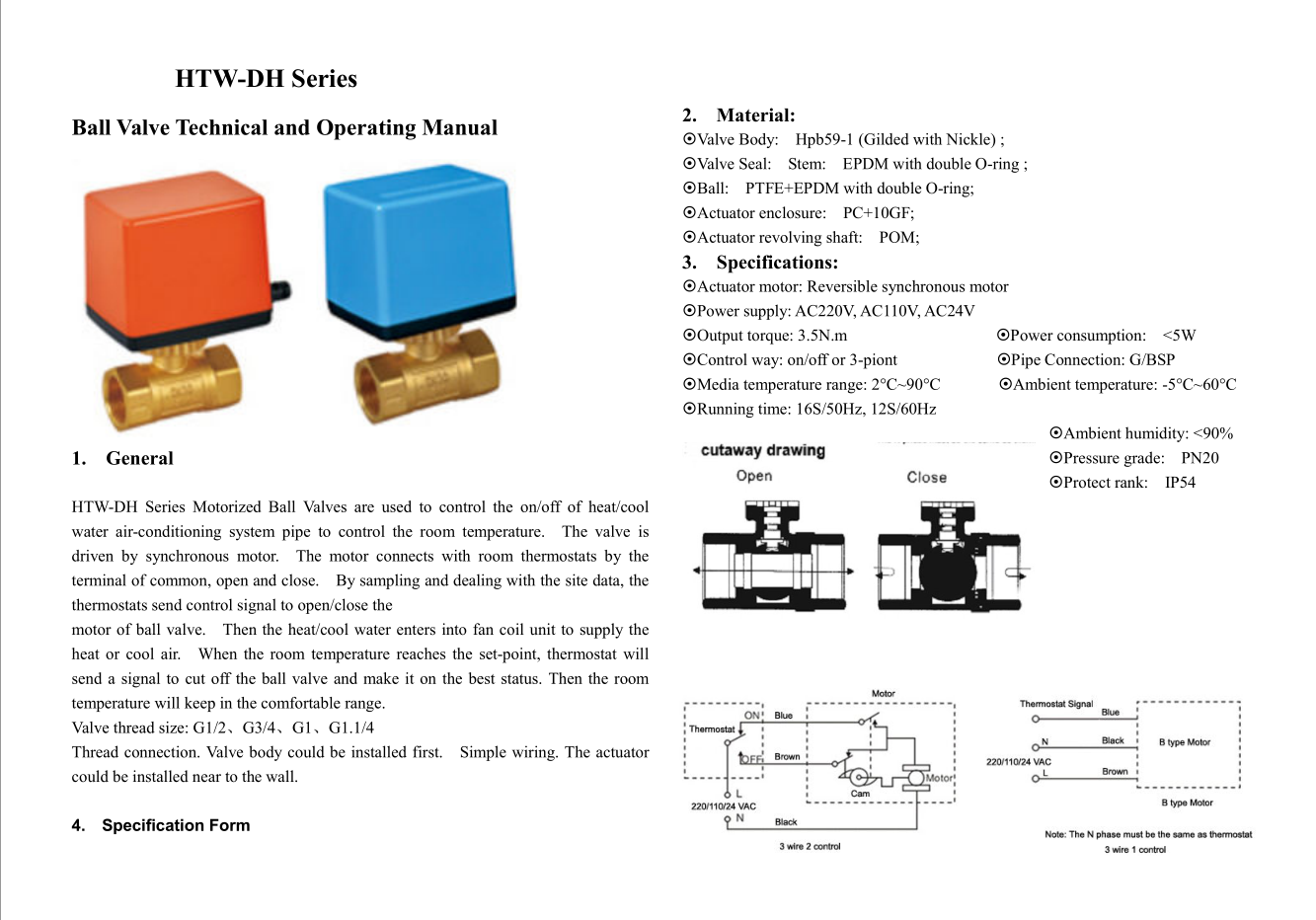 HTW-DH Series Motorized Ball Valves are used to control the on/off of heat/cool water air-conditioning system pipe to control the room temperature. The valve is driven by synchronous motor. The motor connects with room thermostats by the terminal of common, open and close. By sampling and dealing with the site data, the thermostats send control signal to open/close the motor of ball valve. Then the heat/cool water enters into fan coil unit to supply the heat or cool air. When the room temperature reaches the set-point, thermostat will send a signal to cut off the ball valve and make it on the best status. Then the room temperature will keep in the comfortable range.