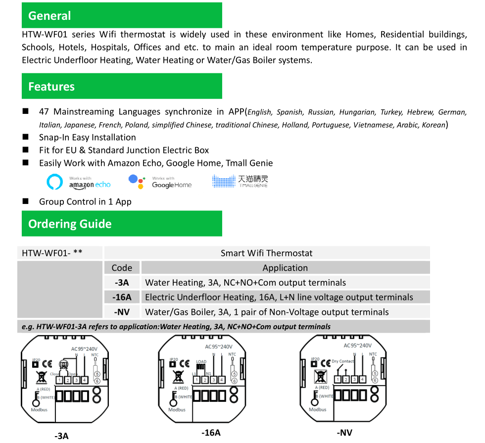 HTW-WF01 series Wifi thermostat is widely used in these environment like Homes, Residential buildings, Schools, Hotels, Hospitals, Offices and etc. to main an ideal room temperature purpose. It can be used in Electric Underfloor Heating, Water Heating or Water/Gas Boiler systems.