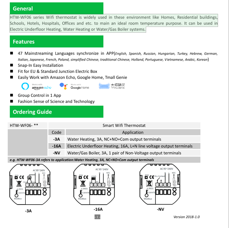 HTW-WF06 series Wifi thermostat is widely used in these environment like Homes, Residential buildings,Schools, Hotels, Hospitals, Offices and etc. to main an ideal room temperature purpose. It can be used in Electric Underfloor Heating, Water Heating or Water/Gas Boiler systems.