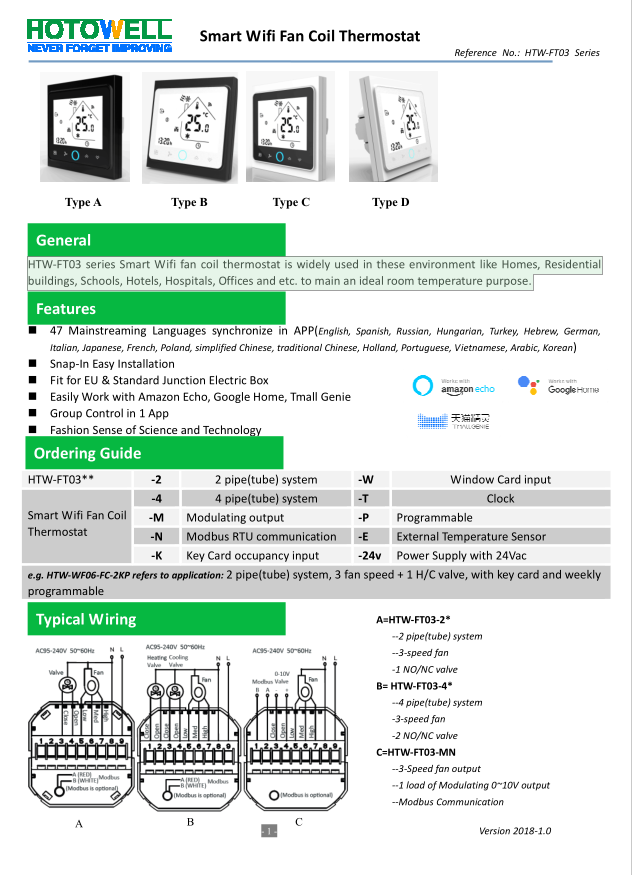 HTW-FT03 series Smart Wifi fan coil thermostat is widely used in these environment like Homes, Residential buildings, Schools, Hotels, Hospitals, Offices and etc. to main an ideal room temperature purpose.