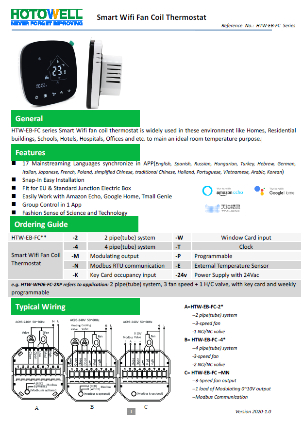 HTW-EB-FC series Smart Wifi fan coil thermostat is widely used in these environment like Homes, Residential buildings, Schools, Hotels, Hospitals, Offices and etc. to main an ideal room temperature purpose.