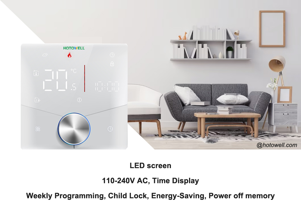 HTW-WF10 series thermostat is widely used to maintain an ideal room temperature. It can be used in Electric Underfloor Heating, Water Heating, or Water/Gas Boiler systems.