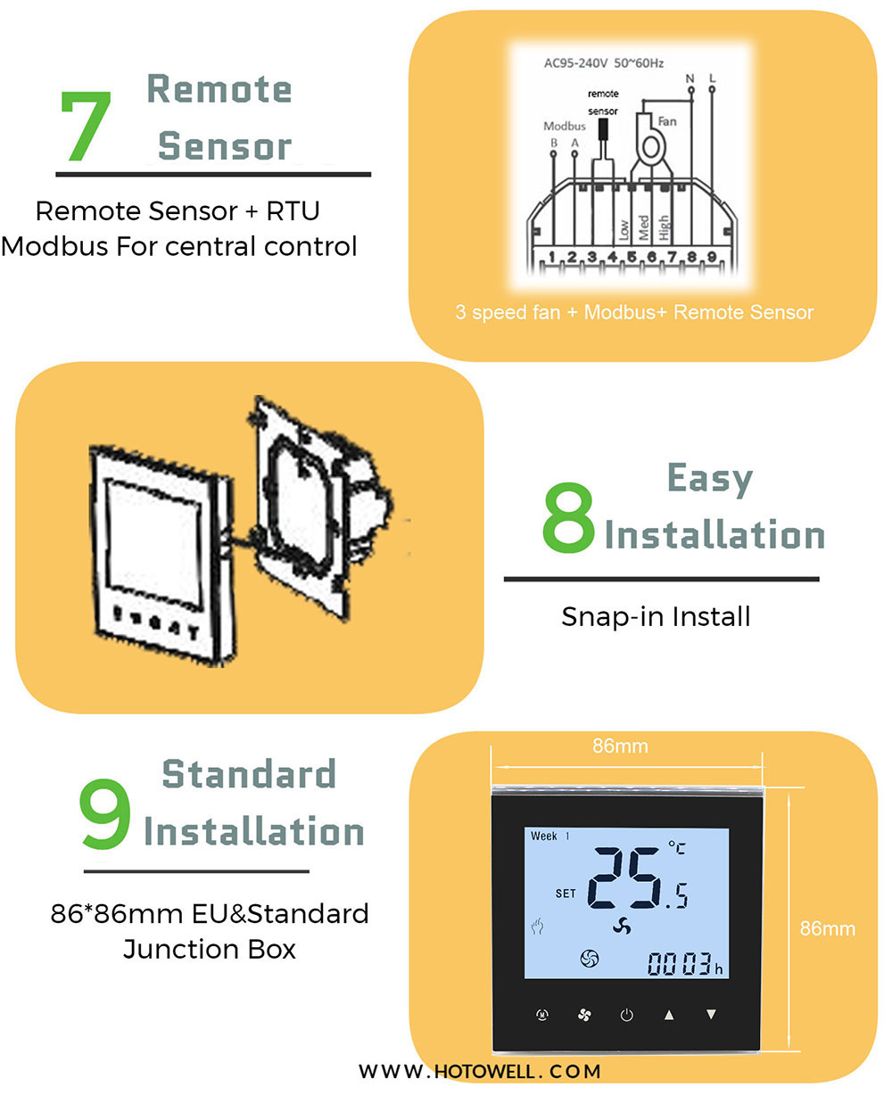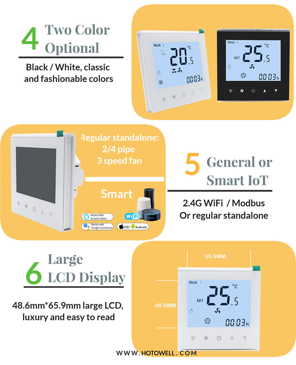This Modbus fan coil thermostat is widely used in these environments like Homes, Residential buildings, Schools, Hotels, Hospitals, Offices and etc. to main an ideal room temperature purpose.