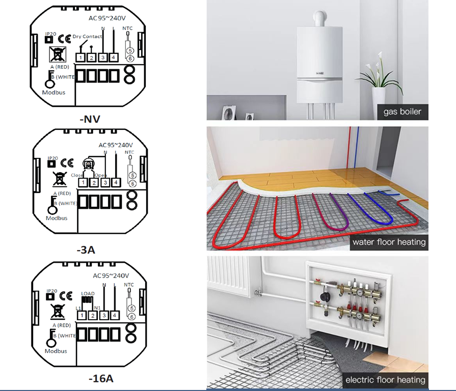 e.g. HTW-WF11-3A refers to application:Water Heating, 3A, NC+NO+Com output terminals