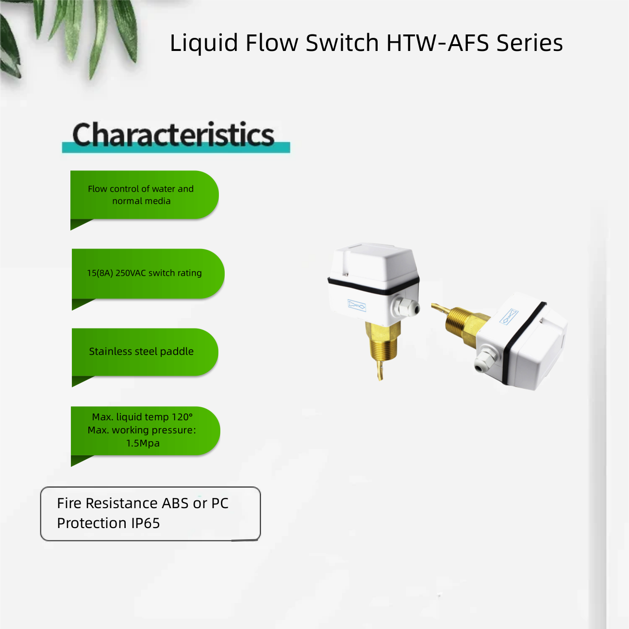Waterproof liquid flow switches control and monitor liquid flow of boilers, pumps, etc., of heating, cooling, and air conditioning equipment.