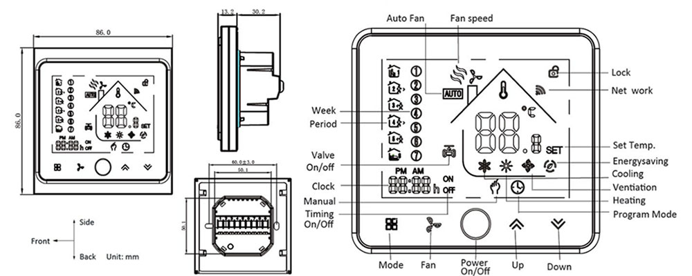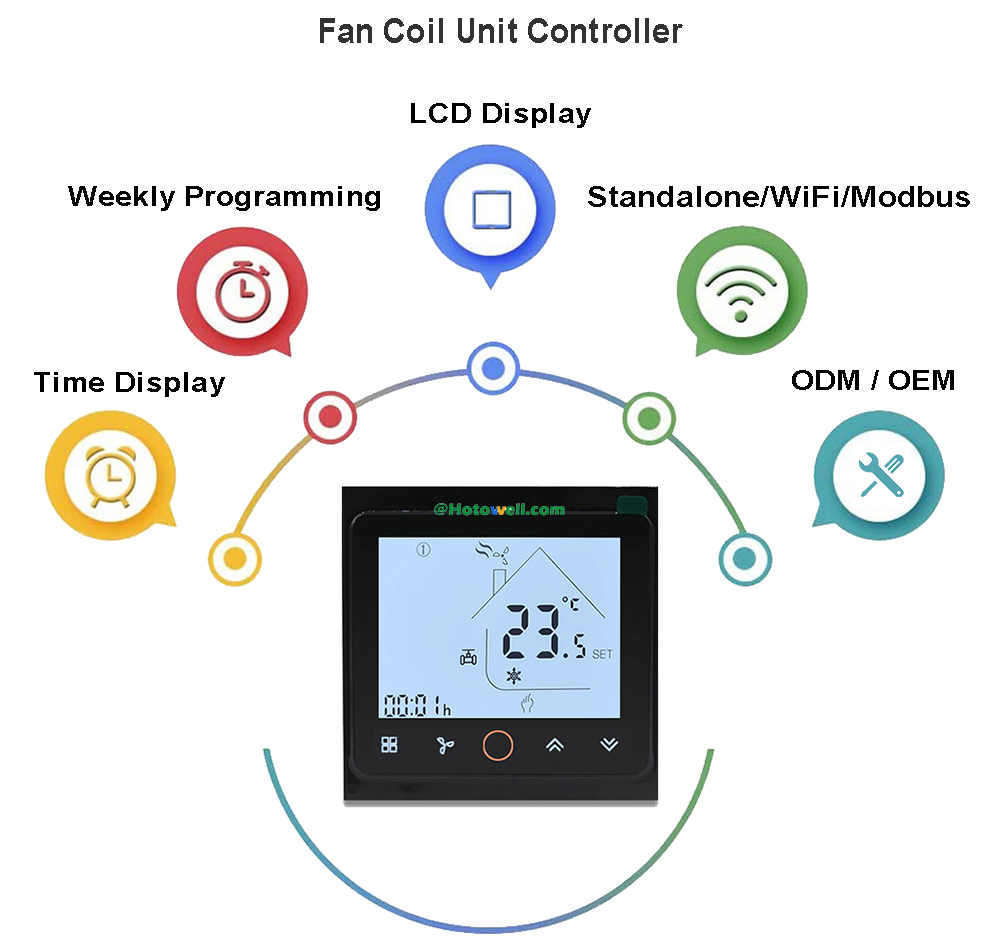 HTW-FT03-MZB. HTW-FT03 series smart fan coil thermostat is widely used to maintain an ideal room temperature in environments such as homes, residential buildings, schools, hotels, hospitals, offices, etc.