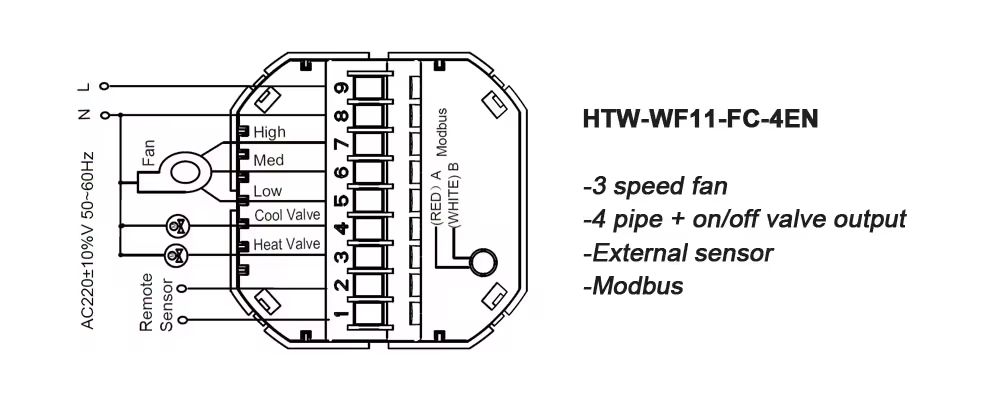 HTW-WF11-FC series standalone fan coil thermostat is to control fan coil system, with 3-speed fan and water based valve outputs, which is widely used in these environment like Homes, Residential buildings, Schools, Hotels, Hospitals, Offices and etc, to main an ideal room temperature purpose.