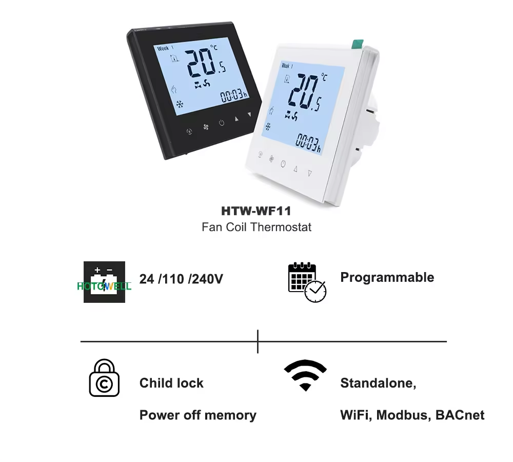 HTW-WF11-FC-2/4 series standalone fan coil thermostat is to control fan coil system, with 3-speed fan and water based valve outputs, which is widely used in these environment like Homes, Residential buildings, Schools, Hotels, Hospitals, Offices and etc, to main an ideal room temperature purpose.