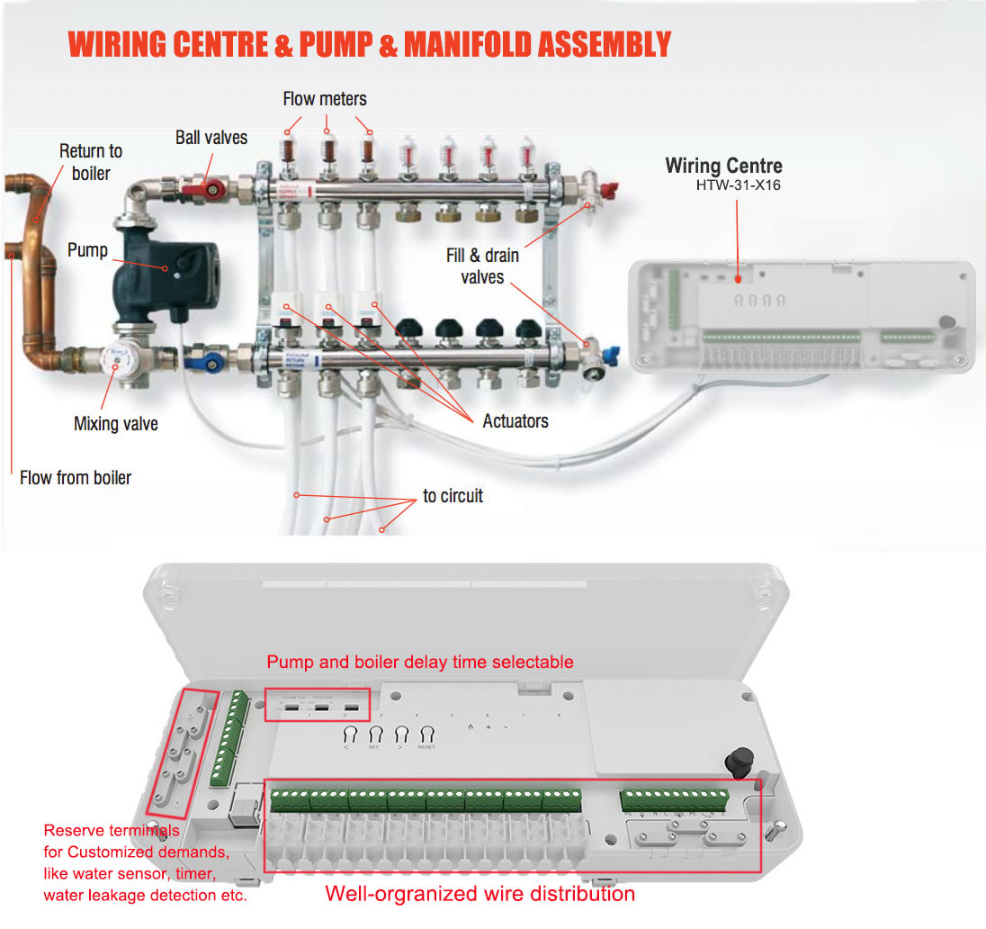 HTW-31-X16W Wiring Centre can control up to 16 zones simultaneously with thermostats. It is used to control any actuator or valve which requires a 230v AC signal. At the same time it offers the ability to operate a boiler through a volt free output.