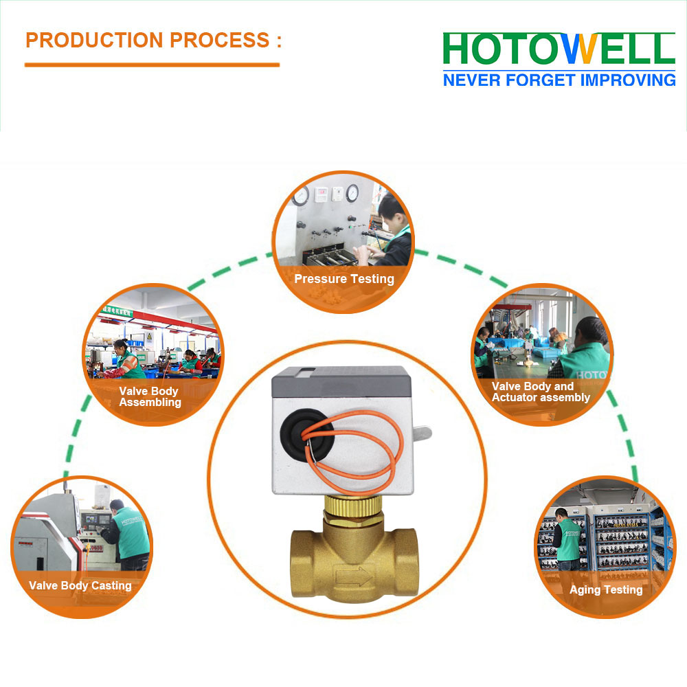 HTW-V71 Series Motorized Valves are used to control the flow of hot water, chill water through the fan coil unit in heating, cooling or air-conditioning applications, so as to control room temperature indirectly. When thermostat sends the controlling signal to the motorized valve, the valve is opened with water flowing, and when the signal disappears, the valve, with the help of its own spring, returns back to its original place to close the valve so as to stop the water flow.