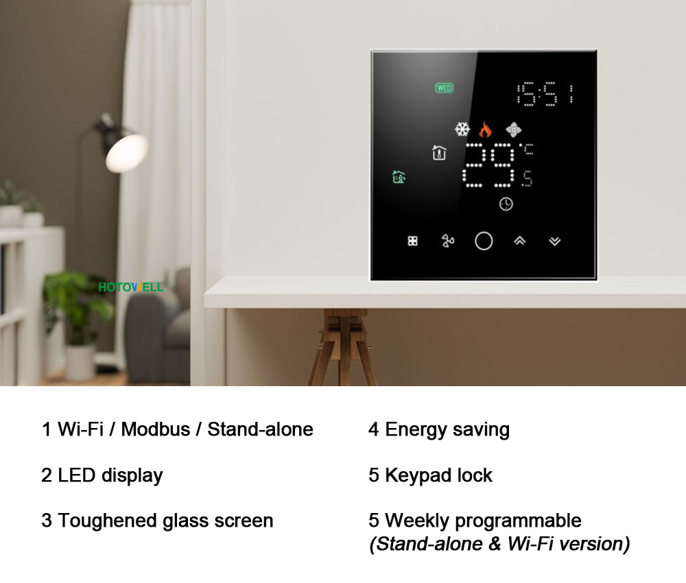 HTW-WF03-FC serie inteligente Wifi termostato fan coil es ampliamente utilizado en estos entornos como hogares, edificios residenciales, escuelas, hoteles, hospitales, oficinas y etc. para principal un propósito ideal temperatura ambiente.