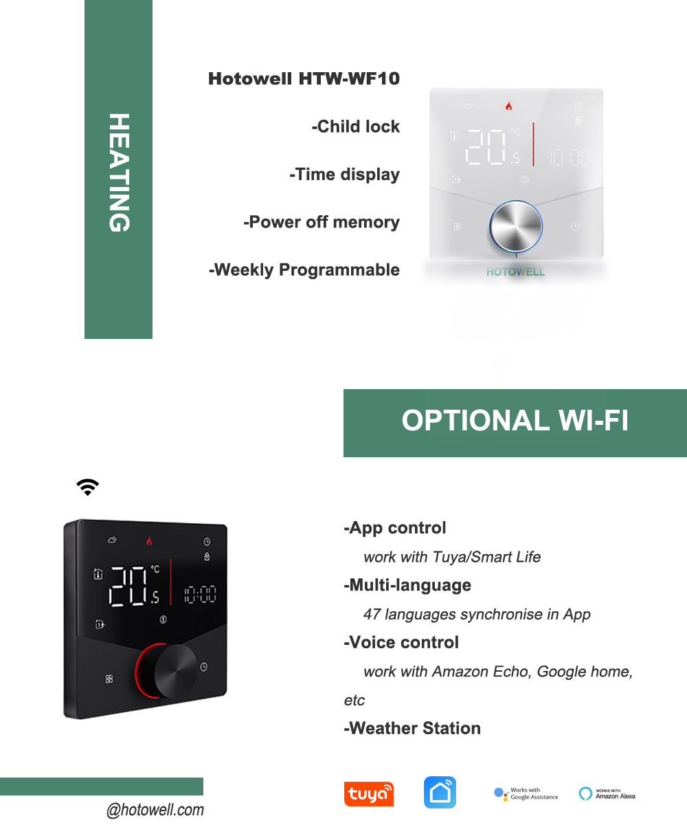 El termostato de la serie HTW-WF10 se utiliza ampliamente para mantener una temperatura ambiente ideal. Puede utilizarse en sistemas de calefacción por suelo radiante eléctrico, calefacción por agua o calderas de agua/gas.
