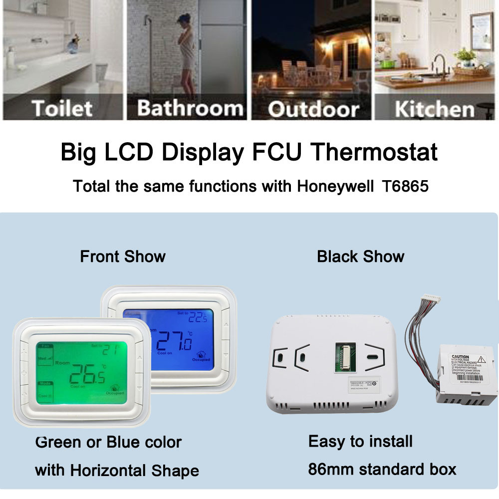 Los termostatos digitales T6865 están diseñados para la aplicación de ventiladores de 3 velocidades y válvulas modulantes en sistemas fan coil. Incluye: 2 tubos sólo frío/sólo calor/conmutación manual Modo ventilación Control manual o automático del ventilador de 3 velocidades Control de la válvula moduladora La velocidad del ventilador puede seleccionarse en modo de control automático o manual de 3 velocidades. En el modo de ventilación, el ventilador sólo admite el control de velocidad manual.