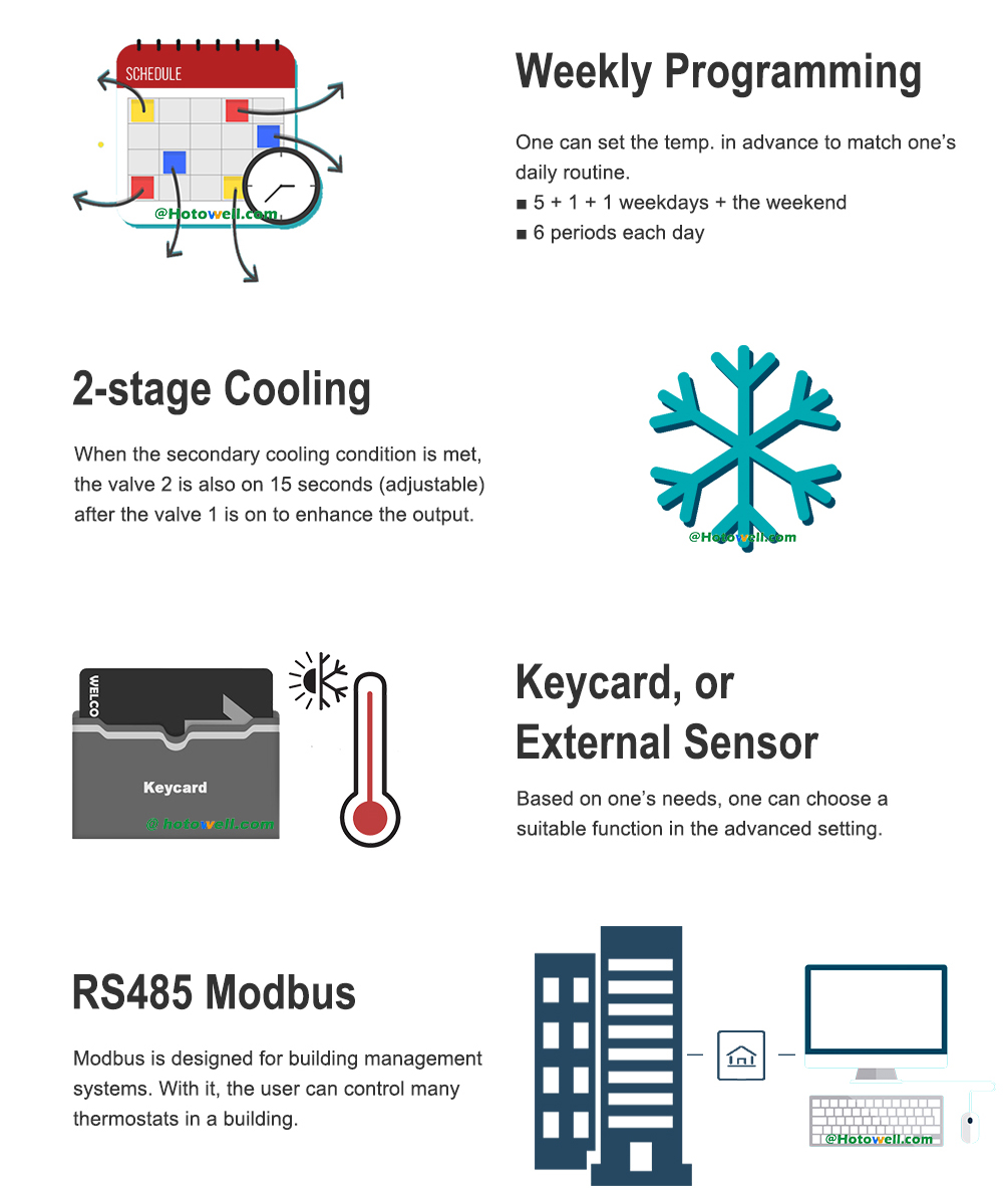Hotowell Nuevo termostato inteligente de 2 etapas de refrigeración RS485 Modbus Termostato Sensor externo