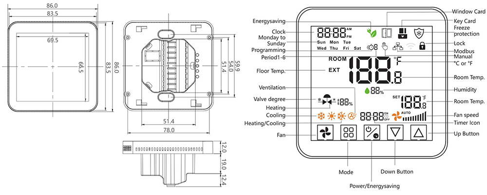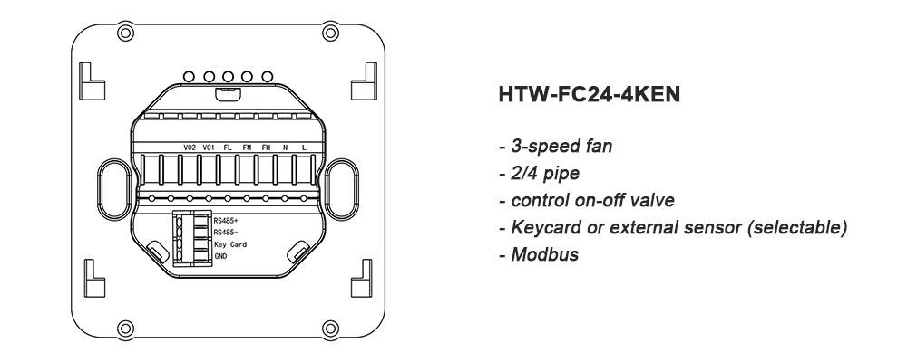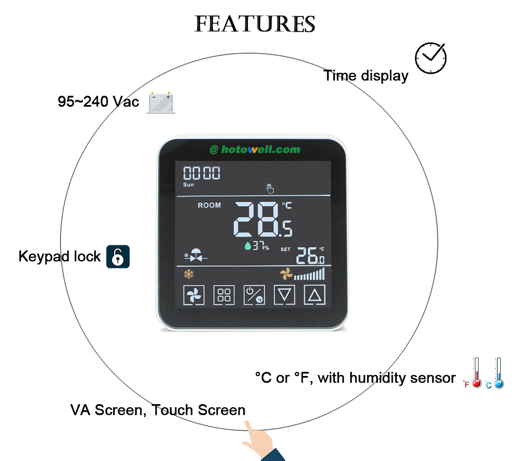 El termostato de ambiente moderno con pantalla táctil HTW-FC24-4KEN está diseñado para controlar el funcionamiento de encendido/apagado de ventiladores y válvulas de 3 velocidades en aplicaciones de unidades fan coil.