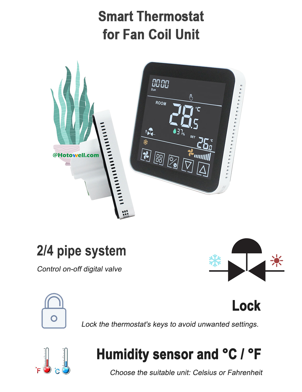 El termostato de ambiente moderno con pantalla táctil HTW-FC24-4KEN está diseñado para controlar el funcionamiento de encendido/apagado de ventiladores y válvulas de 3 velocidades en aplicaciones de unidades fan coil.