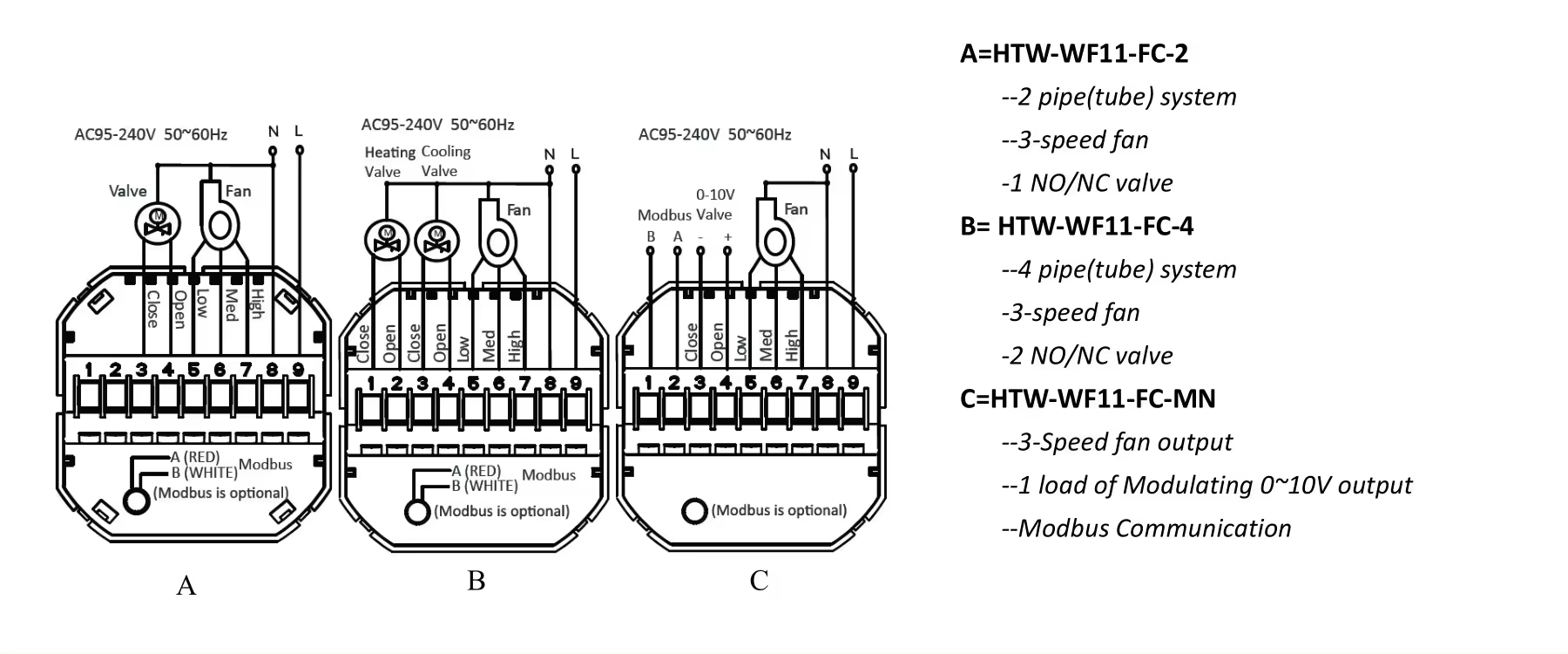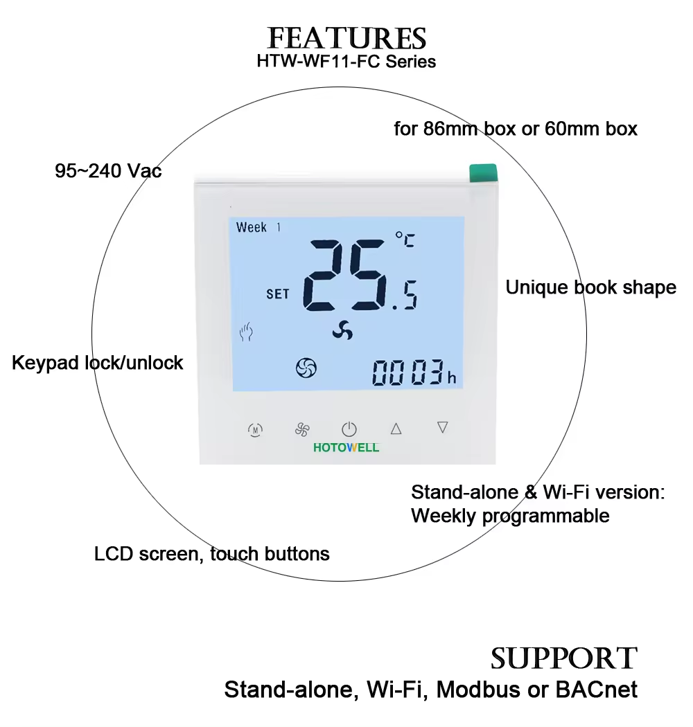 El termostato de fan coil HTW-WF11-FC-2/4 es un termostato autónomo para controlar el sistema de fan coil, con ventilador de 3 velocidades y salidas de válvula basadas en agua, que se utiliza ampliamente en entornos como hogares, edificios residenciales, escuelas, hoteles, hospitales, oficinas, etc., para mantener una temperatura ambiente ideal.